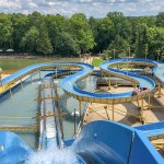 Op de wildwaterbaan van het grote pirateneiland kun je een verfrissende en actievolle tocht maken langs het 360 meter lange kanaal in twee boomstammen van wel 14 meter hoog in boomstamboten.